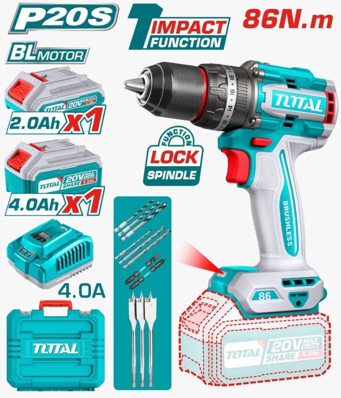 Atornillador inalámbrico TOTAL sin escobillas 20 V 86 NM