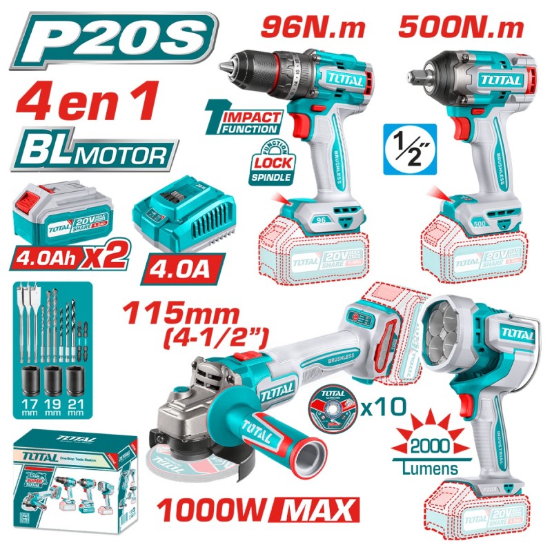 COMBO 4 EN 1. TALADRO 96NM + LLAVE 500NM + AMOLADORA + LINTERNA TOTAL