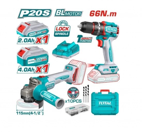 COMBO KIT TALADRO DE IMPACTO 66NM Y AMOLADORA 115MM A BATERÍAS 20V BL TOTAL