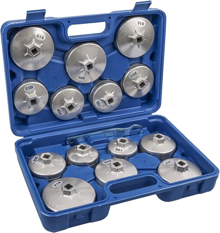 - 14 tapones de filtro de aceite en diferentes tamaños: 901 (65 mm), 902 (67 mm), 903-3 (74 mm), 903-4 (73 mm), 904 (79 mm), 905-1 (74 mm), 906 (84 mm), 907911-1 (79 mm), 914 (101 mm), 915 (92 mm). 1 llave de anillo.